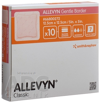 Allevyn Gentle Border 12,5×12,5cm, adhezívne hydrocelulárne penové krytie so silikónovým gélom.